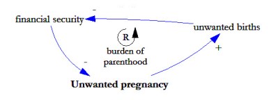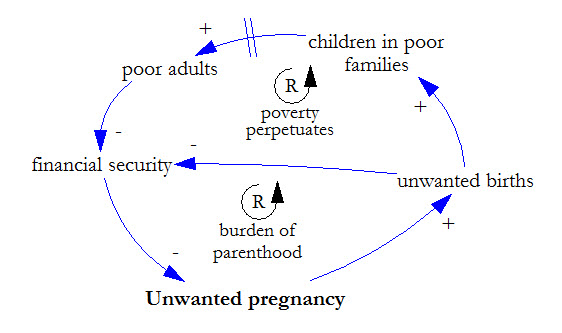 Additionally, unwanted births resulting from financial insecurity lead to more children in poor families (see model below), who will be more likely to become poor adults due to barriers to accessing resources and opportunities while growing up. This perpetuates the cycle of poverty and leads to even less financial security in the future. Because these less financially secure adults are more likely to view pregnancies as unwanted, then we can say that this system creates even more unwanted pregnancies in the future. This second reinforcing feedback loop happens on a much longer timescale, with a delay of somewhere around 20 years before we see the effect of an unwanted birth leading to more unwanted pregnancy.