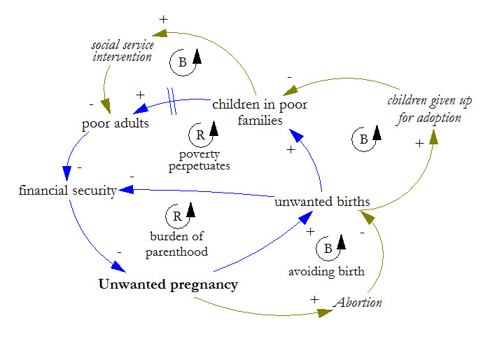 Left to its own devices this is how the system would work. Unwanted pregnancies would build momentum and get worse and worse, so our society has designed a number of interventions to try to control these reinforcing loops (marked by gold arrows in the model below). We offer adoption services to free mothers from the enormous burden of parenthood. A portion of government spending is devoted to social services like education and healthcare to break the cycle of poverty. The stigmatization of premarital sex can also be viewed as a socio-cultural innovation to the problem of unwanted pregnancies. We also came up with the much-debated and morally challenged medical operation that is a hot topic in the political climate today: Abortions. Each of these new variables introduces a balancing feedback loop, where an abortion or adoption today prevents the need for an abortion or more social services in the future.