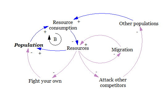 As a population grows, so does resource consumption. As available resources fall, the average lifespan of each population will fall, leading to higher death rates and a smaller population. In order for a population to maintain growth, it must find new resources, fight its own kind, or eliminate competitor populations (see model below). We see populations search for new resources when wildebeests begin migration or when human explorers colonized and develop new lands. We see populations fight their own through lion pride takeovers or when one human civilization fights another for control over gold and oil. We see competitors eliminate each other when cheetahs and leopards kill unattended lion cubs, and when humans hunt wolves to protect livestock or when humans kill each other, focusing on skin color or religious differences to make enemies seem alien and inhuman.
