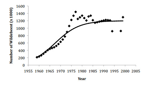 The chart below shows the exponential wildebeest population growth after 1955. But after reaching 1.4 million in 1975, there is a leveling off to 1.2 million as the population comes into equilibrium with its expanded carrying capacity and strenuous lifestyle. If we told you that the Great Migration wasn’t always around, can you guess when it started based on the graph behavior below?