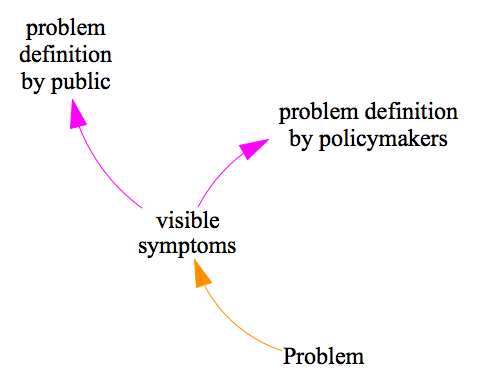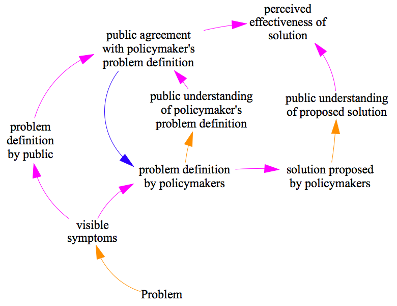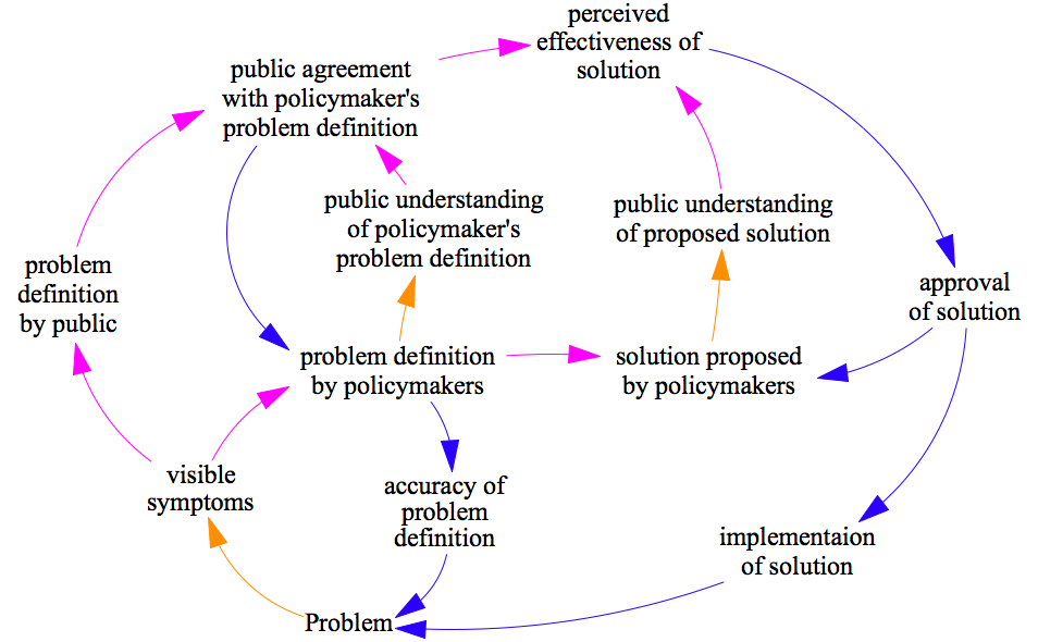 Politicians craft a solution that should solve the problem, or what they have defined to be the problem. Citizens come to understand  the policymaker’s proposed solution through the media (the orange Information Link), and they can assess how well the proposed solution fits the defined problem. Using a systemic frame of mind, they can ask: does the solution proposed address this problem holistically and not just the salient symptoms? Systems thinking tools can help us improve our Thinking Links by enhancing our understanding of the cause-effect structures of complex problems.