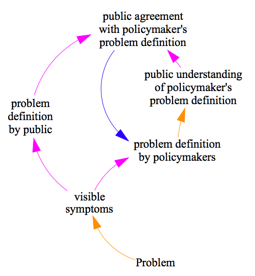 Once policymakers have defined the problem, they will communicate it to the public through various news media to the people (represented by the orange Information Link below). If the people have independently conceived of the problem, they can compare their definitions and communicate their agreement or disagreement about the problem, which will help refine understanding.