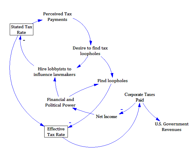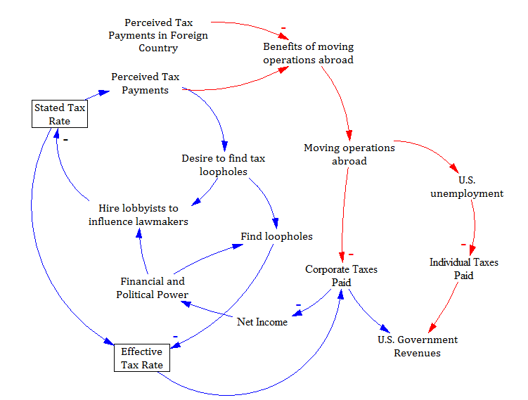 Let’s take a systems thinking approach to understand the cause-effect relationships at play in the corporate tax system. The systems diagram below shows how corporations may react to a high stated tax rate.
